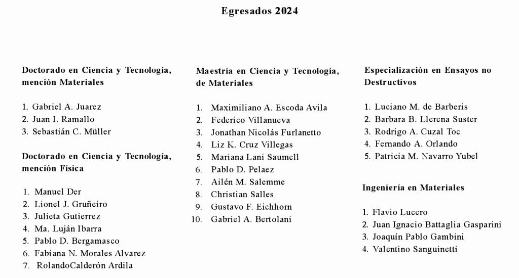 Diez de los estudiantes culminaron el doctorado en Ciencia y Tecnología (tres con mención en materiales y siete en física), diez egresaron de la maestría en Ciencia y Tecnología de Materiales; cinco de la especialización en Ensayos No Destructivos y cuatro de la carrera de Ingeniería en Materiales.