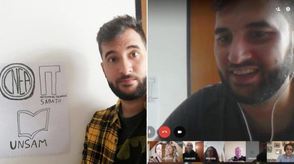 Juan Manuel Giordano está por realizar su defensa de Trabajo Final para egresar como Ingeniero en Materiales. Frente a él hay una pantalla con un mosaico de caras que lo miran. Saluda a los docentes. Comienza la defensa virtual.