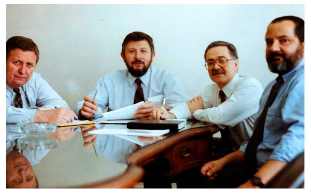 Pochettino hizo referencia a esta foto, que se encontró hurgando para los festejos de los 25 años, donde se lo ve junto al Dr. José R. Galvele, al Dr. Eduardo J. Savino y al Lic. Luis Quesada, delineando los pilares para la creación del INSTITUTO SABATO a comienzos de la década del 90.