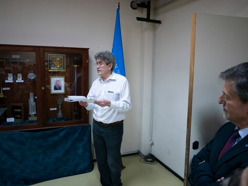 En el Aula B que lleva su nombre, se realizó el homenaje al primer director del Instituto, José R. Galvele. El Dr. Ricardo Carranza, actual coordinador de posgrados, fue quien presentó la vitrina que se montó para el homenaje y que permanecerá en el aula, conteniendo todos los premios que recibió Galvele a lo largo de su trayectoria: Premio “U.R. EVANS”, del Institute of Corrosion (Inglaterra), por sus trabajos de investigación sobre mecanismos de picado y corrosión bajo tensión; Premio KONEX DE PLATINO en “Ingeniería civil, mecánica y materiales”; Premio “W.E. WHITNEY”, de la National Associacition of Corrosion Engineers (NACE) en reconocimiento a las destacadas constribuciones a la ciencia de la corrosión; Medalla reconocimiento “programa Multinacional de Metalurgia” de la OEA; entre otros.